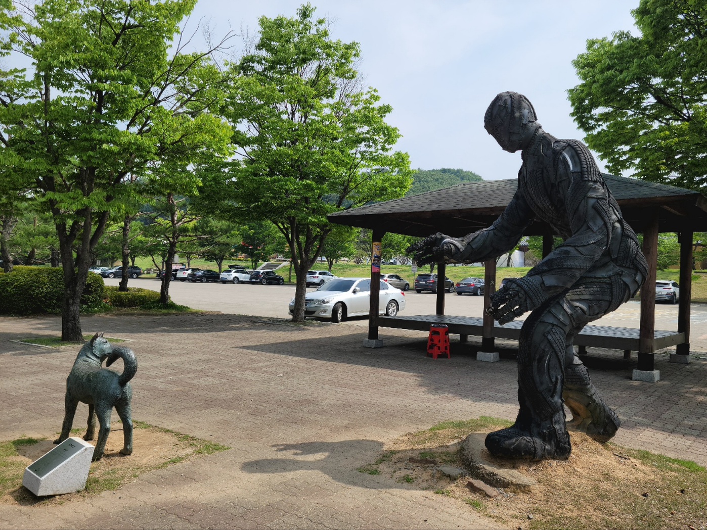 주차장에 이런 조각물이 되어 있어 눈길이 갔습니다. 작품명은 잉여인간이었고 강아지와 마주 보는 조각상이 흥미로웠습니다.