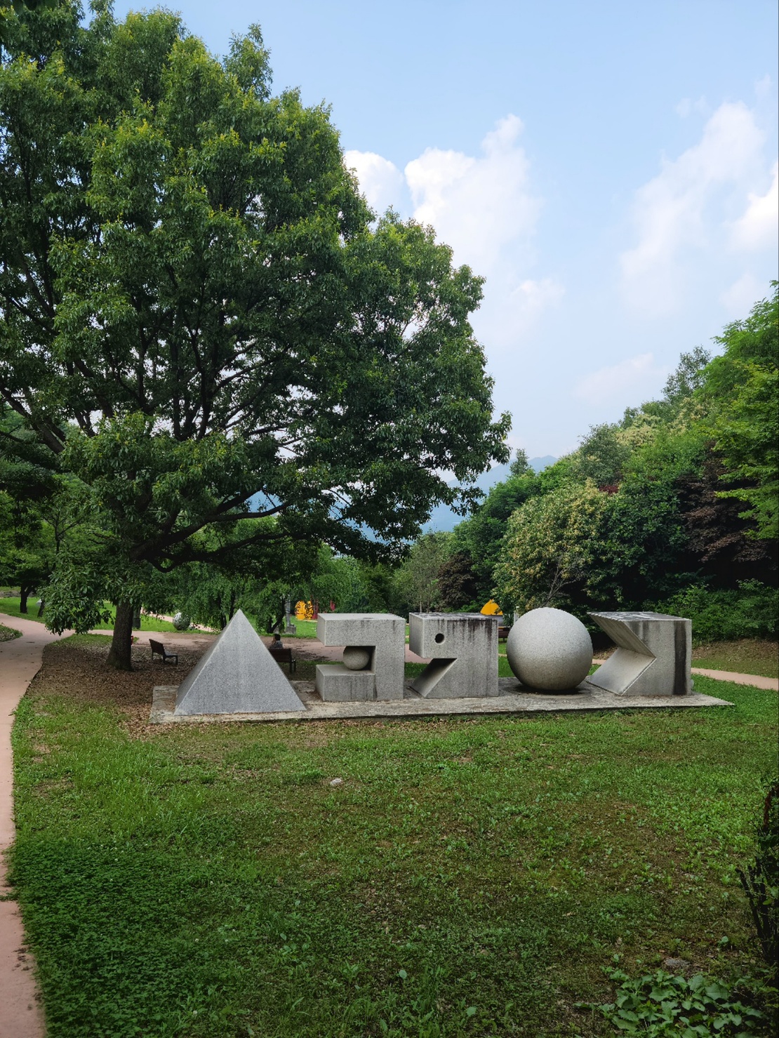 왼편으로 크게 돌며 산책하는 길에 여러 조각품들과 나무집으로 만들어진 쉼터들이 눈에 들어왔어요.
