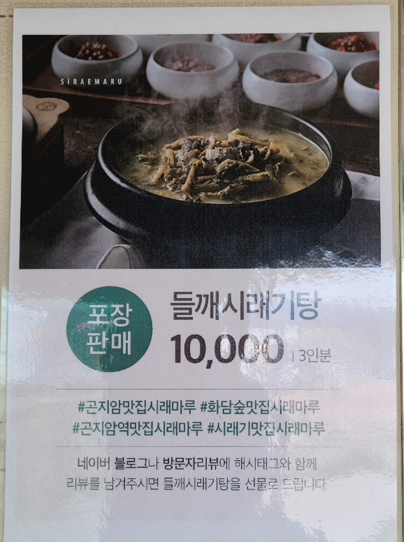 포장판매용으로 들깨 시래기탕이 3인분에 10,000원이었습니다. 아래 네이버 블로그나 방문자 리뷰에 해시태그를 하면 들깨 시래기탕을 선물로 준다 하니 방문하여 식사를 하신 후 꼭 리뷰 남겨 시래기탕 선물 받아 가세요. 포장하여 집에서 먹어본 봐 정말 고소하고 맛있었습니다.