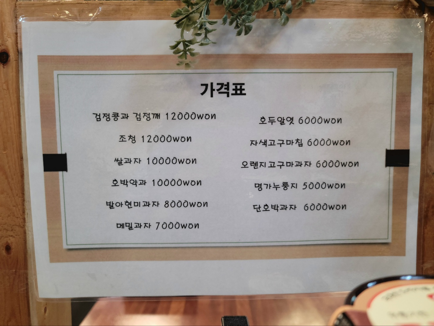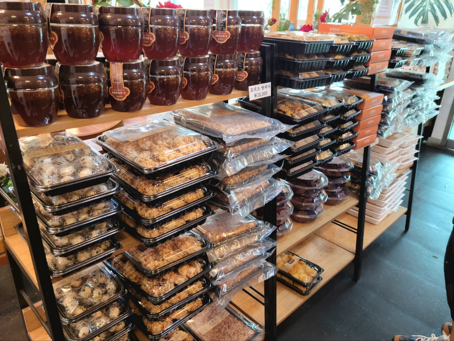 진열된 과자류와 도라지청에 눈길이 갔습니다. 도넛모양의 강정부터 오란다나 호박칩등 다양하게 구비되어 손길까지 가게 만들었습니다.