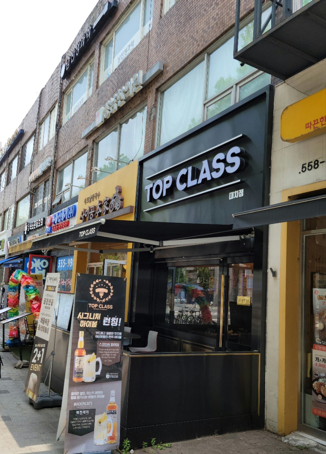 위치는 은마사거리 고 피자 대각선길, 공차를 등지고 오른쪽으로 걸어가다 보면 나옵니다. 지나가다 보면 이렇게 하이볼이나 맥주등을 파는 입간판이 먼저 보여 얼핏 지나가다 보면 즉석떡볶이가게인지 인지를 못하게 되더라고요. 한솥도시락과 베트남사이공본가 사이에 위치하고 있습니다. 검은색 외관에 영어로 TOPCLASS를 찾아가면 됩니다.