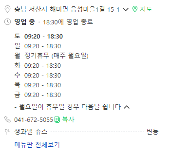 매주 월요일은 쉬고 영업시간은 오전 10시~오후 6시, 점심시간은 오후 1시~2시까지라고 합니다. 재료 소진 시 일찍 마감될 수 있다고 하니 참고하시면 될 것 같아요.