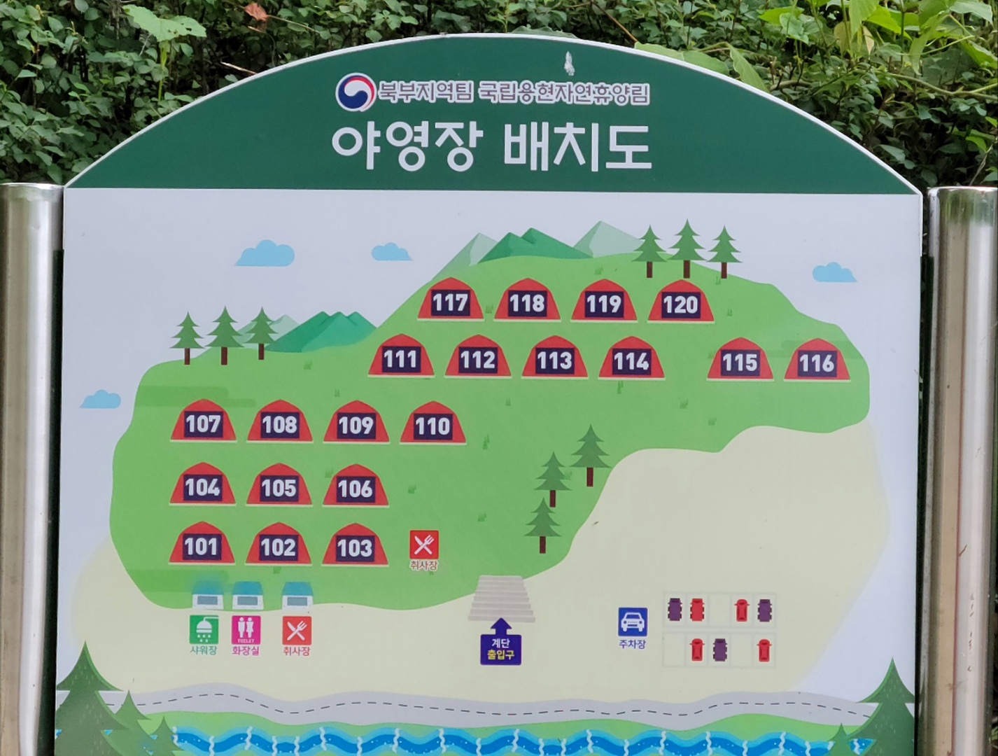 야영장배치도입니다. 각 라인마다 약간의 언덕이 있어 층이 구별됩니다. 보기와는 다르게 그렇게 높지 않아 어느 사이트등 화장실이나 취사장 이용이 편합니다. 야영장에 있는 취사장은 찬물만 나오고 화장실옆 취사장에는 전자레인지와 온수도 제공되니 알고 계시면 좋을 것 같아요.