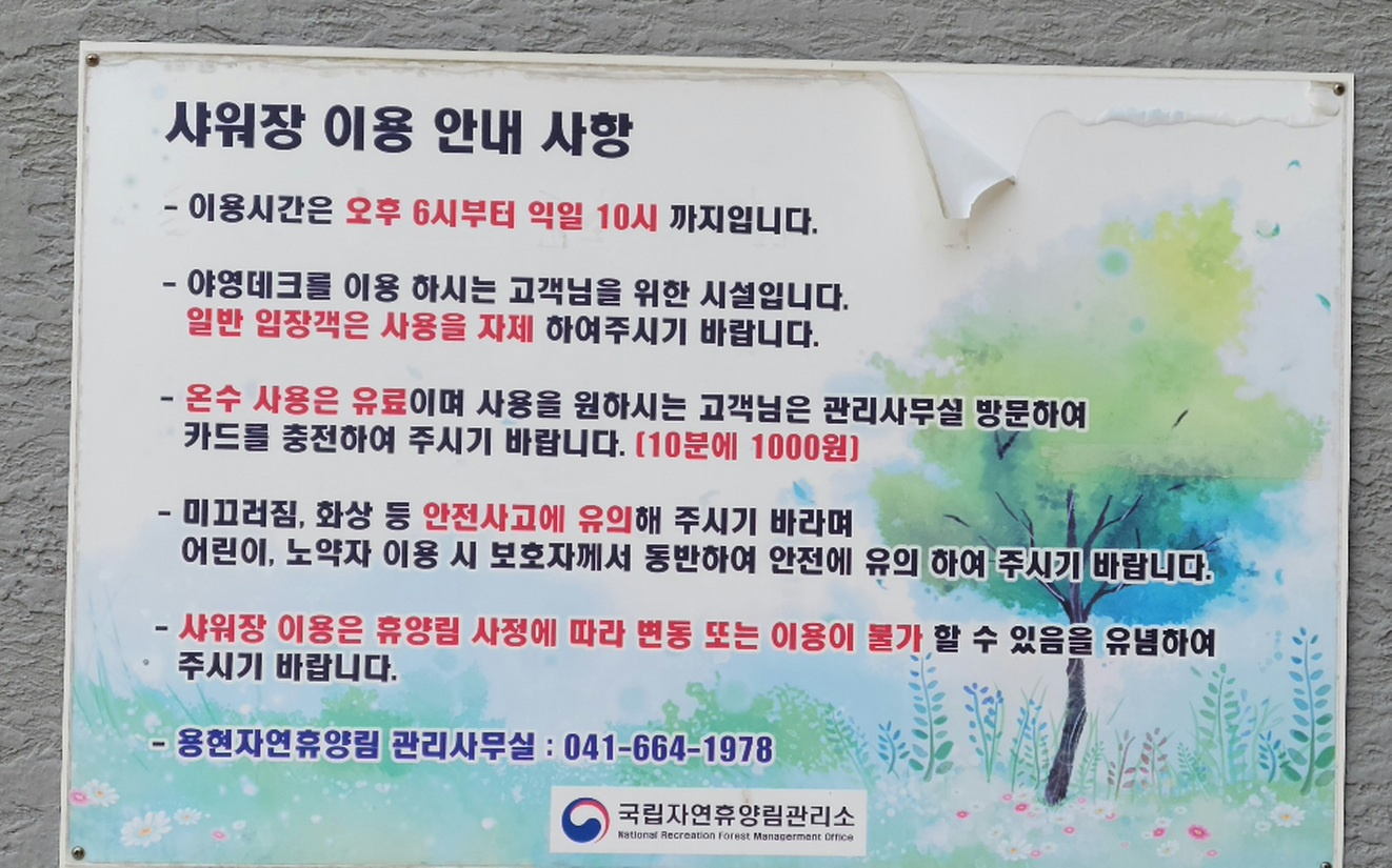 입구에서 샤워장 사용 시 온수이용료가 10분에 1,000원 부가되니 필요하면 카드충전하여 사용하시면 됩니다.