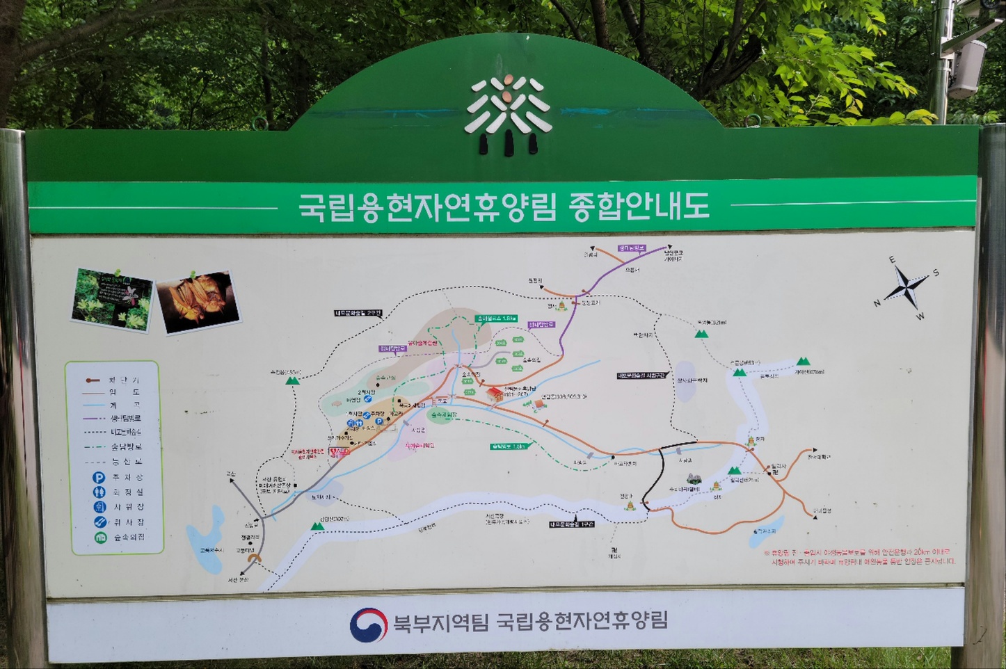 휴양림 종합안내도입니다. 등산이 목적이 아닌 생태길을 따라 도는 것이 목표여서 보라색선과 초록색 선을 따라 산책을 하였습니다.