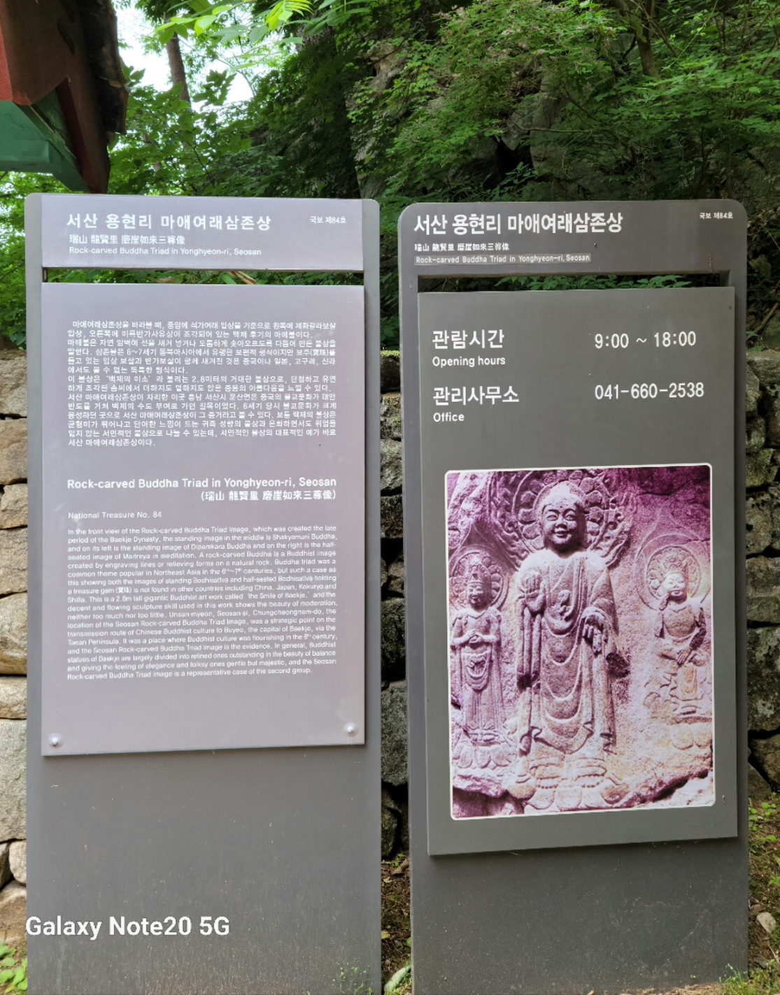 드디어 마주하게 된 마애여래삼존상입니다. 문화재출입 및 접촉금지를 하고 있고, 보존을 위한 여러 가지 장치를 해놓고 있어요.