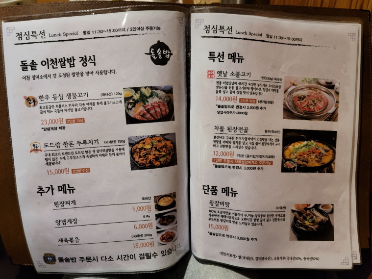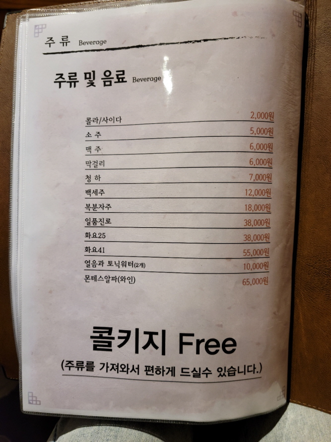 다양한 메뉴로 구성되어 있었고, 콜키지 프리라는 글귀가 마지막에 눈길을 사로잡았습니다. 다음에는 와인 한 병 챙겨 가야겠어요.