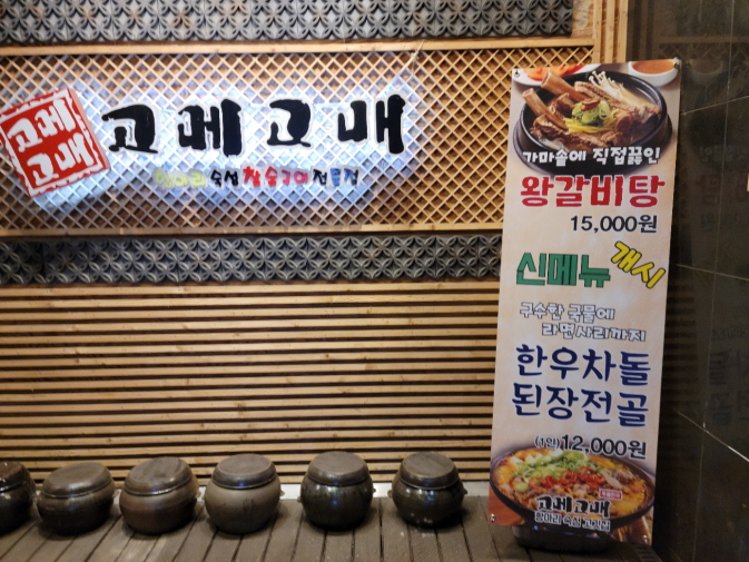 건물외관에서 광고하듯 항아리숙성 고깃집으로 유명하며 점심에도 돌솥밥정식 등을 맛볼 수 있다고 합니다. 4인 단독룸에서 120석의 단독룸까지 있어 회식이나 모임에도 제격으로 보였습니다. 지하로 한층 내려가면 정겨운 간판이 눈을 사로잡네요.