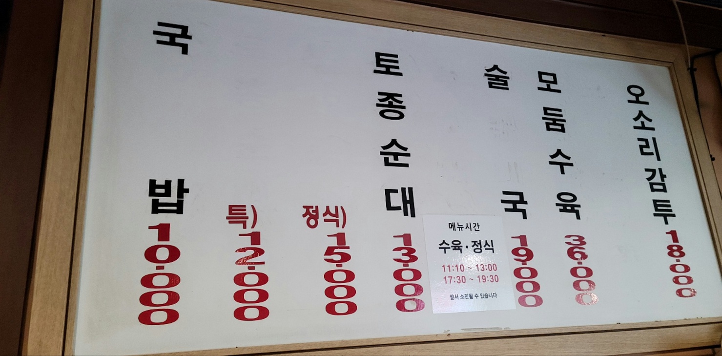 국밥이 10,000원, 특 12,000원, 정식 15,000원입니다. 수육이나 정식의 경우 제공되는 시간이 정해져 있습니다. 오전 11시 10분~오후 1시까지와 오후 5시 30분부터 오후 7시 30분까지로 되어 있는데 조금 늦으면 소진되어 먹지 못하는 경우가 생깁니다. 넉넉한 양에 국밥만 먹어도 좋지만 수육정식도 함께 즐기면 더 든든하고 맛있어요.