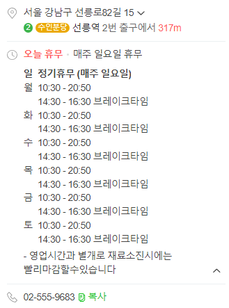 제가 다녀온 곳은 선릉 2호점입니다. 4시 30분까지 브레이크 타임이고 5시쯤 이른 저녁식사를 위해 들렀습니다.