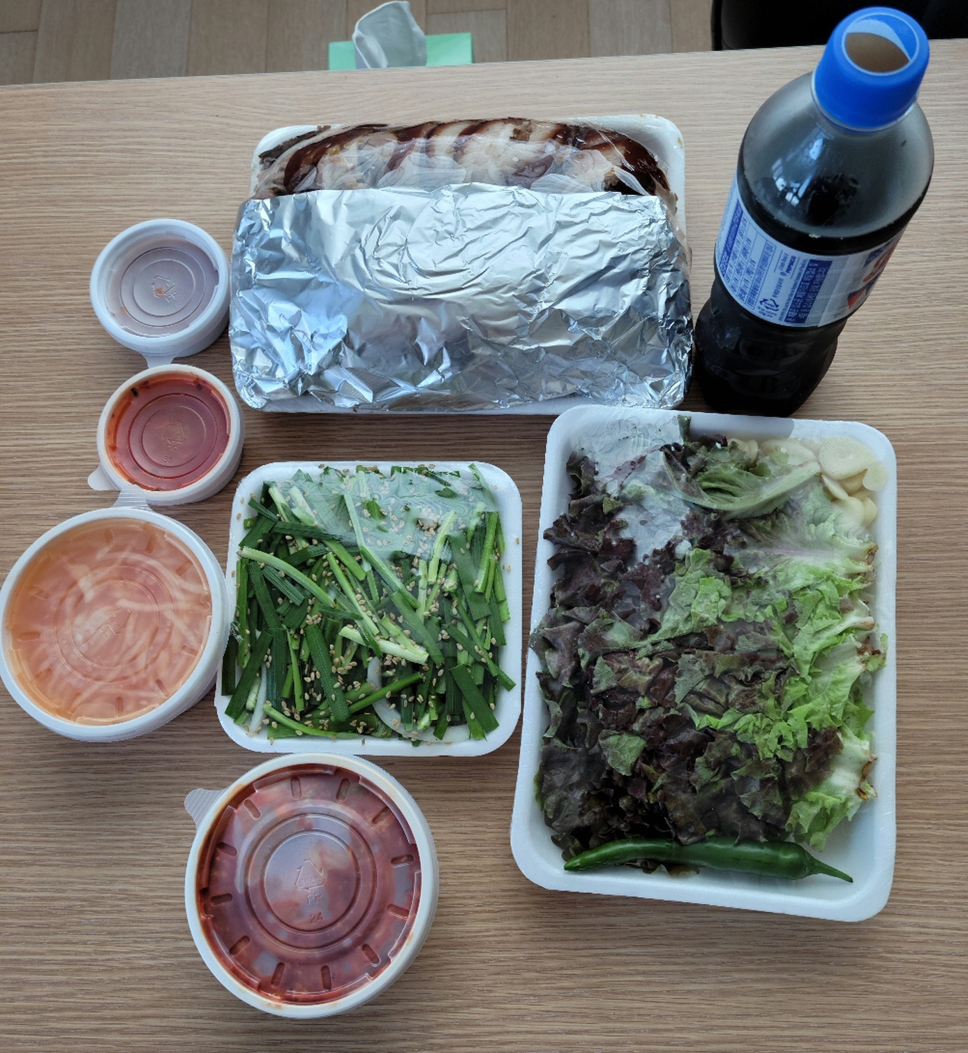 모둠족발 주문 시 이렇게 포장됩니다. 족발과 상추, 부추무침, 무생채와 겉절이, 새우젓과 쌈장, 콜라를 깔끔하게 포장해 주십니다.