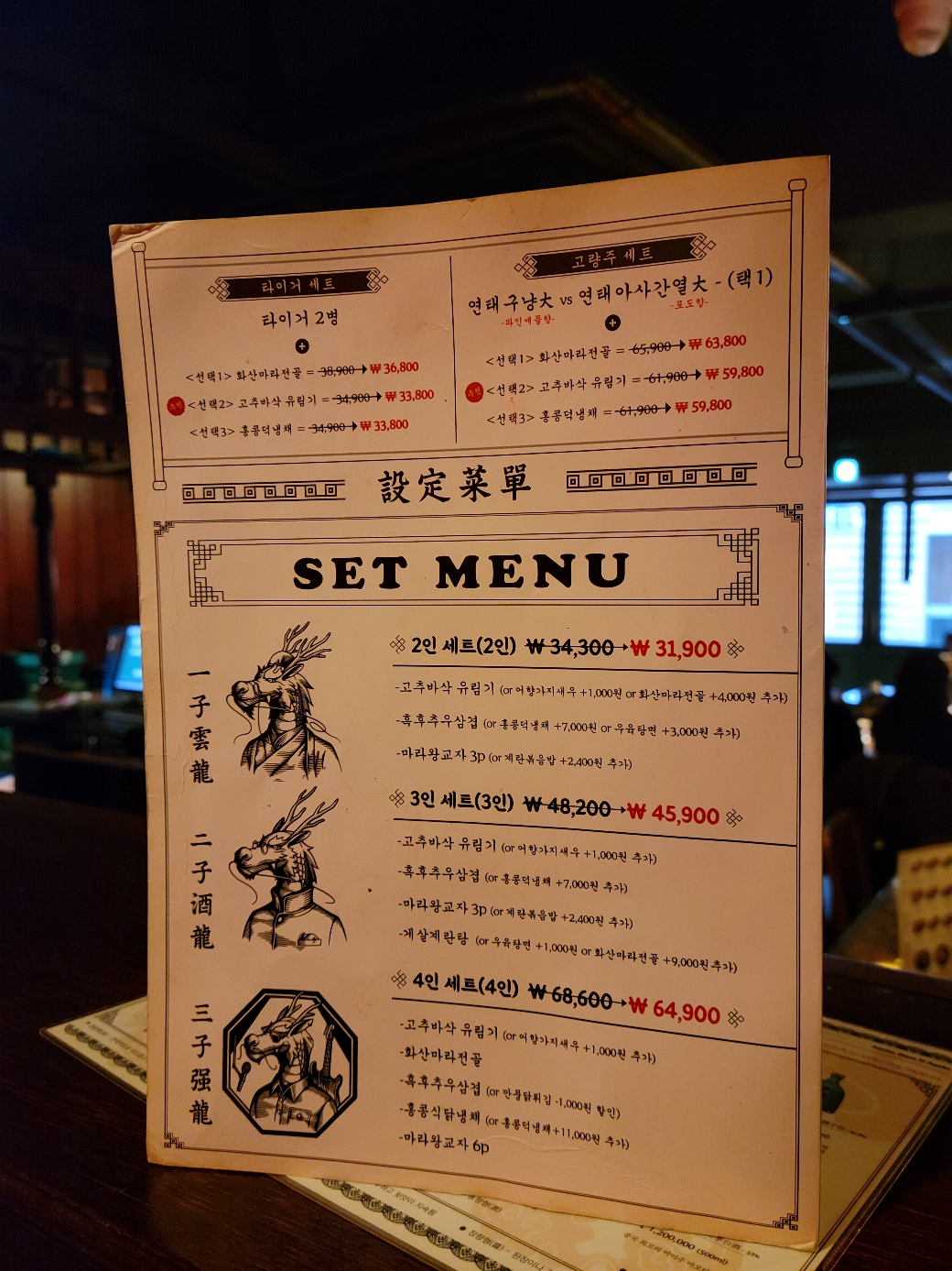 세 명이서 가서 더 많은 메뉴를 선택하여 먹지 못했지만 3인세트 구성에 마라전골까지 제법 알찼고 양도 많았습니다. 간단하게 먹는 것도 좋고 배부르게 먹기 위한 메뉴도 있고, 술안주로 다양한 요리들이 준비된 용용 선생이 줄 서는 식당에 나온 이유가 있었던 것 같아요. 오다가 홍콩스러운 분위기에 다양한 음식 즐기고 싶다면 들러보시길 추천합니다.