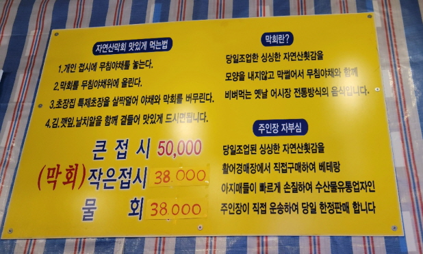 벽에 붙어 있는 먹는 방법으로 먼저 무침야채 즉 회와 함께 나온 오이와 어린잎을 접시에 놓은 후 막회를 올려놓습니다. 초장집의 초장을 살짝 올려 버무린 후 김이나 깻잎, 날치알과 곁들여 먹으면 정말 맛이 좋습니다. 해초류 역시 초장에 버무려 먹으면 그 또한 맛이 좋아요. 막회라는 이름이 생소할까 하여 이름에 관련한 내용도 잘 설명해 놓으셨네요.