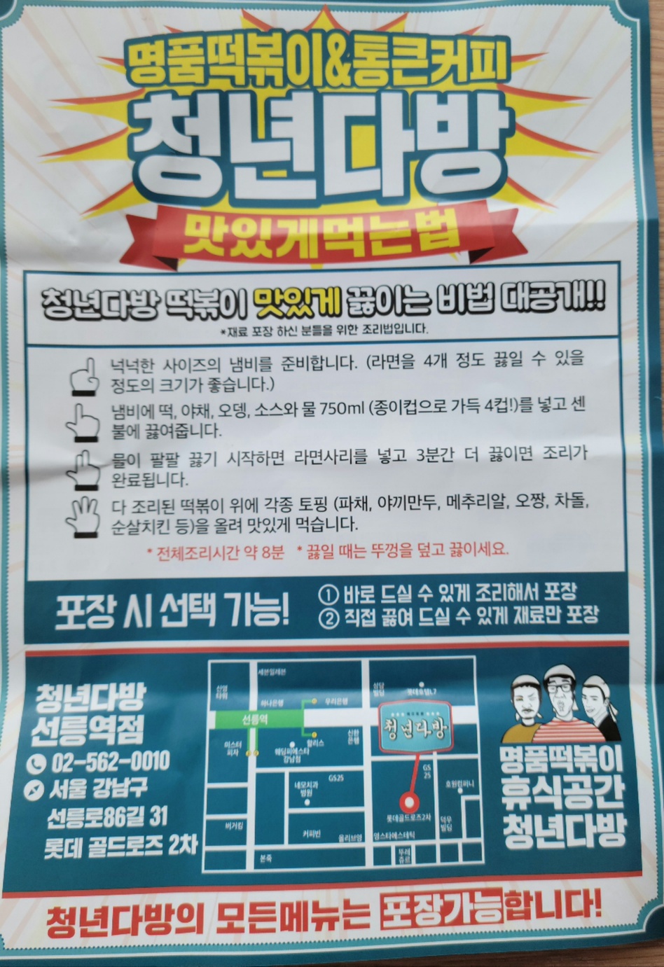 다방이라 들었을 때는 카페인줄 알았던 청년다방은 떡볶이 맛집입니다. 우연히 알게 되어 자주 애용하는 이곳의 떡은 길고도 쫀득한 맛이 매력적인 곳입니다. 선릉역 메인거리는 아니지만 롯데 골드로즈건물에 위치하고 있어 찾기는 어렵지 않습니다. 떡볶이 맛있게 즐길 수 있는 청년다방 꼭 방문해 보세요~