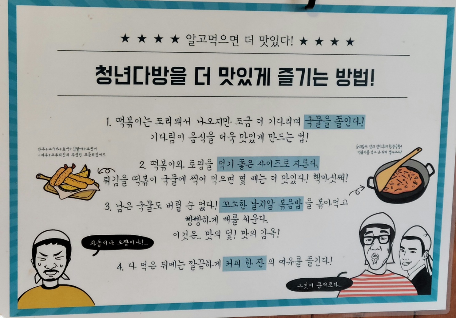 직접 방문하여 먹을 때 자세히 안내해 주는 문구예요. 캐릭터를 청년답게 잘 표현해 주었네요~^^