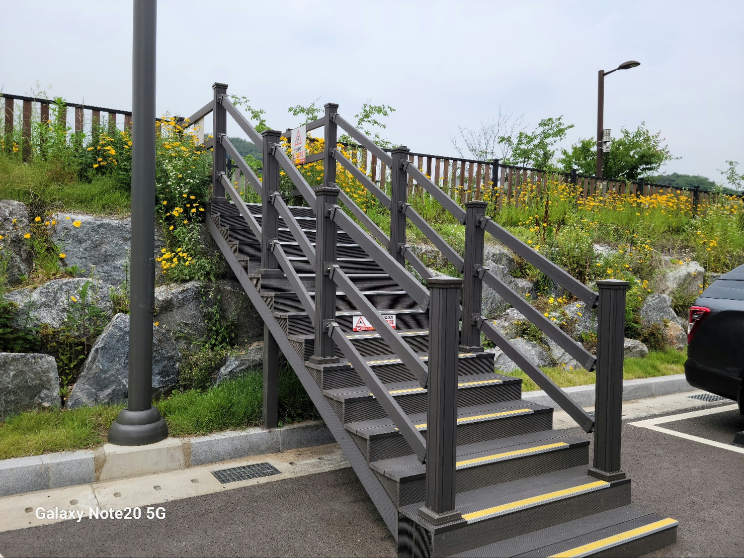 주차장에서 둘레길로 올라가는 계단입니다. 노란 꽃과 데크길이 어우러져 보는 눈이 즐거운 곳이었습니다.