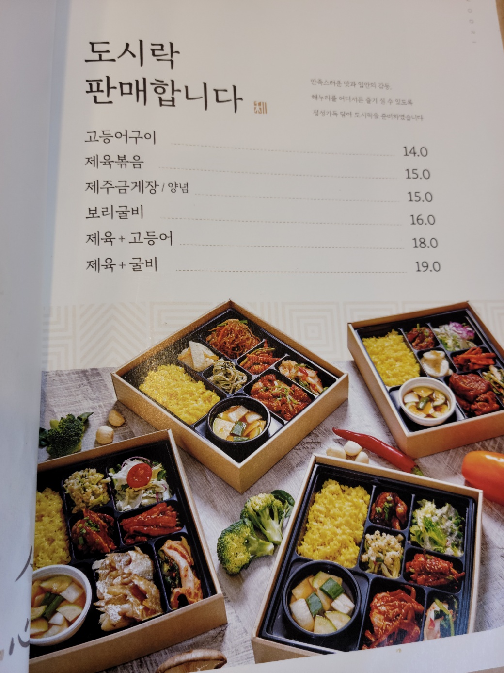한상차림 금액이 예전보다 조금은 오른 것이 확인되었고, 도시락 판매에도 눈길이 갔습니다. 맛을 보고 필요할 때 요긴하게 준비해야지 하는 전투적인 마음으로 들여다보게 되었네요.