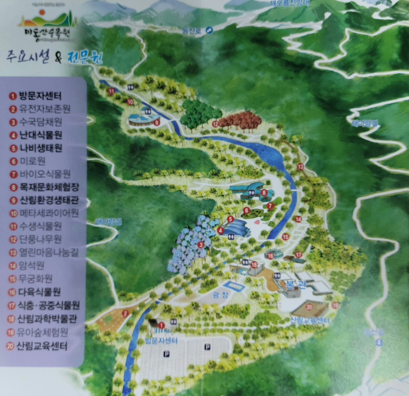 예쁘게 정리된 수목원 안내도에서 관람시간과 관람코스등을 확인할 수 있습니다. 빨간 선을 따라가면 등산을 위한 코스로 해오름 전망대까지 오르고 내려오는데 3시간 10분 정도 소요된다고 합니다. 저희는 노란색으로 표시된 길을 따라 돌아오는 코스로 정하고 출발합니다.