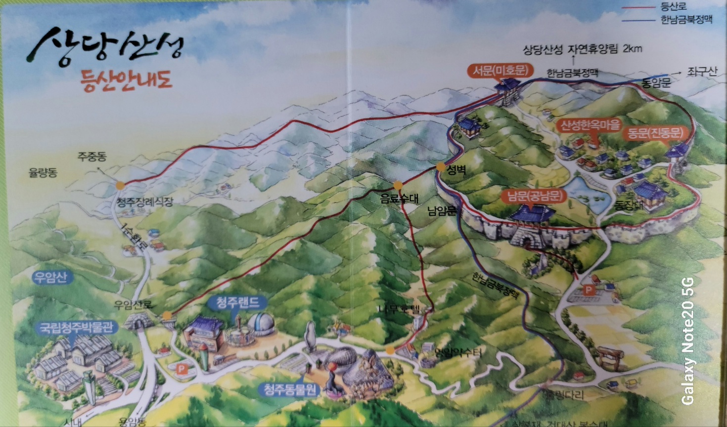 청주랜드주차장→우암산순환로→ 음료수대→ 성벽→ 서문 →북장대 →동문, 산성마을 서남암문→ 것대산 봉수대