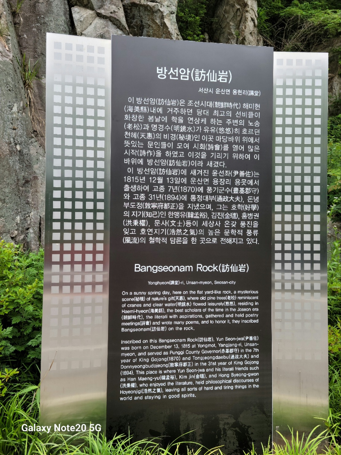 주차장으로 돌아가는 길에 방선암이라 하여 돌에 새겨놓은 바위가 보였습니다. 조선시대 해미현에 거주하던 선비들이 화창한 봄날의 학을 연상케 하는 주변의 노송과 명경수가 유유히 흐르던 천혜의 비경인 이곳 마당바위 위에서 뜻있는 문인들이 모여 시작을 한 것을 기리기 위해 바위에 새겼다고 합니다.
