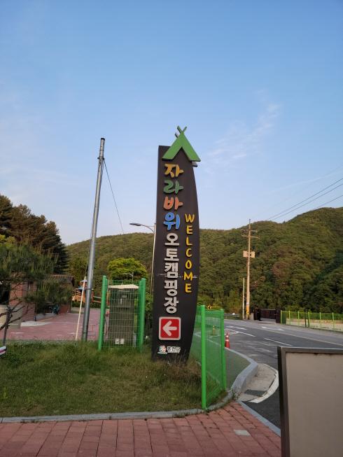 자라바위 오토캠핑장 입구입니다. 들어갈 때 차단기가 내려있어 벨 누르고 예약자명 말하면 열어주세요. 관리사무실에 가서 쓰레기봉투 구입하시고, 예약한 사이트로 이동하시면 됩니다.